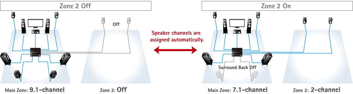 Intelligent Amp Assign automatically assigns amplifier channels to certain speakers, depending on what functions are selected. For example, in a 7.1-channel system, when Zone 2 is off, all 7.1 channels will be used in the Main Zone. However, when Zone 2 is on, power to the two Surround Back channels will be directed to the two speakers in Zone 2, and the Main Zone will receive 5.1 channels of power. Similarly, when CINEMA DSP 3D is on, the two Front Presence speakers will be powered and not the two Surround Back speakers. When CINEMA DSP 3D is off, this situation is reversed. Furthermore, in a 5.1.2-channel system for Dolby Atmos or DTS:X, when Zone 2 is off, all 5.1.2 channels will be used in the Main Zone. However, when Zone 2 is on, power to the two height / overhead channels will be directed to the two speakers in Zone 2, and the Main Zone will receive 5.1 channels of power. Thanks to Intelligent Amp Assign, there’s no need to switch the speaker cables on the rear of the receiver―one more way Yamaha makes your life a little easier.