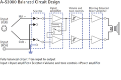 The A-S3000 features fully balanced signal transmission. Moreover, the control system circuits (volume, tone, etc.) of the pre amp feature totally balanced operation, realising ideal balance in all stages.