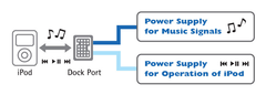 The iPod dock has an independent power supply to prevent operating or charging current from the iPod from flowing into the amp ground signal. This ensures optimum iPod sound quality.