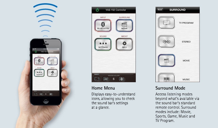 The YAS-152 is compatible with a free app controller (HT Controller) for iOS and Android. Its easy-to-see and easy-to-use operating screen uses icons to let you easily perform a variety of operations including setting surround programmes or sound quality while watching your smartphone or tablet screen.