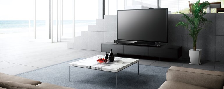 The size and powerful sound are perfect for large screen TVs. Bluetooth® is built in and control via a smartphone app is possible. This is a one-body sound bar for enjoying TV or music easily and with high sound quality.