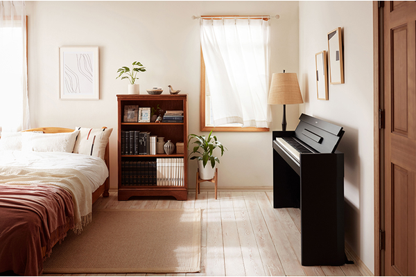 The piano cabinet has a slim depth that lets you neatly install it in any room, and makes for a chic, stylish design that effortlessly enhances your living space. Moreover, closing the keyboard lid gives the instrument a flat, unassuming look.