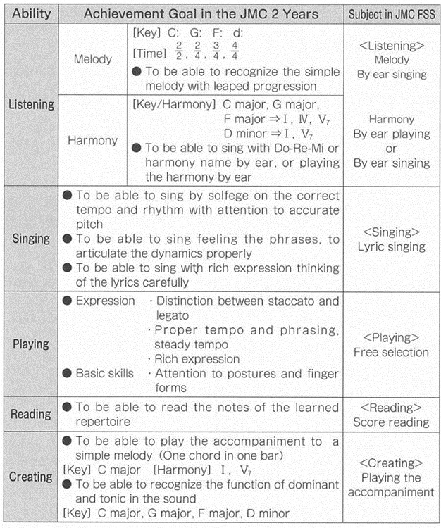 The abilities of 'listening': 'singing': 'playing': 'reading': and 'creating' are to be confirmed and evaluated by the examiner objectively through the elements.